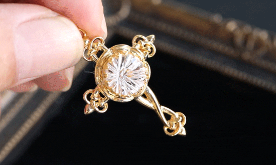 中心には10mm水晶をセットし、まばゆく力強い煌めきを放ちます。動くたびに華やかなブリリアンスが胸元を照らします。