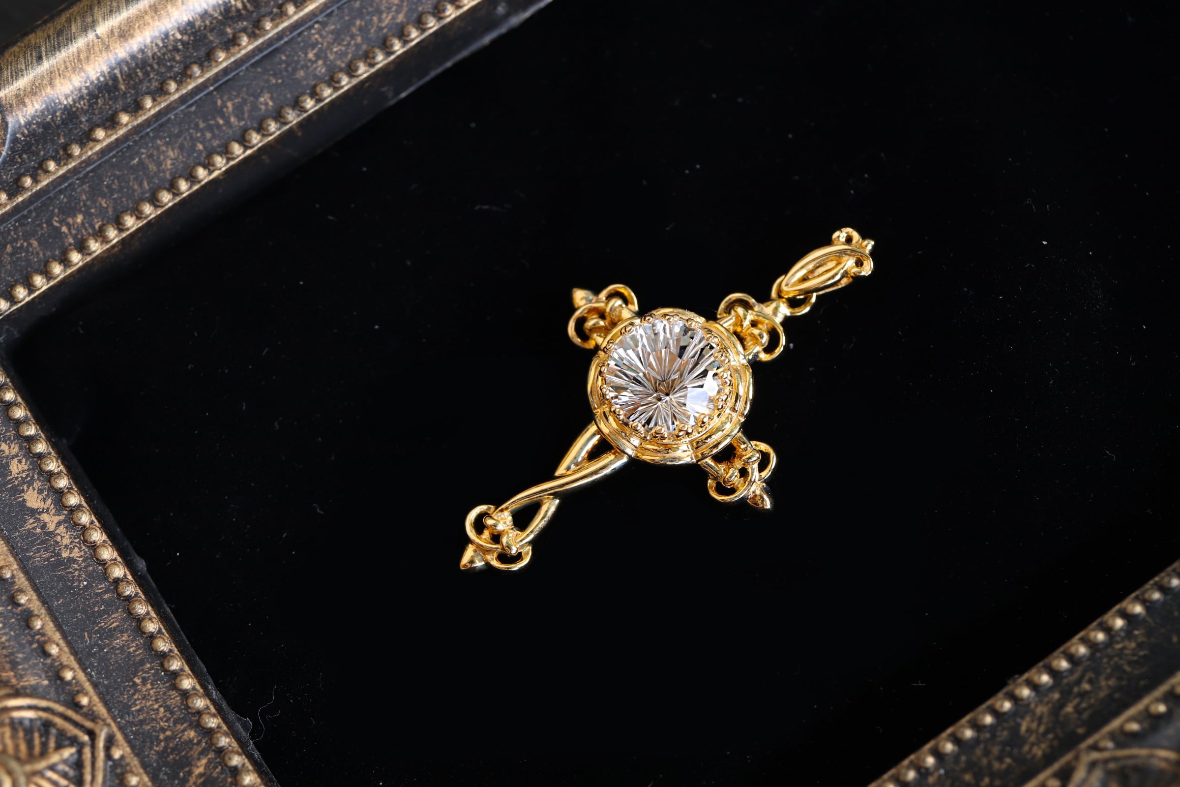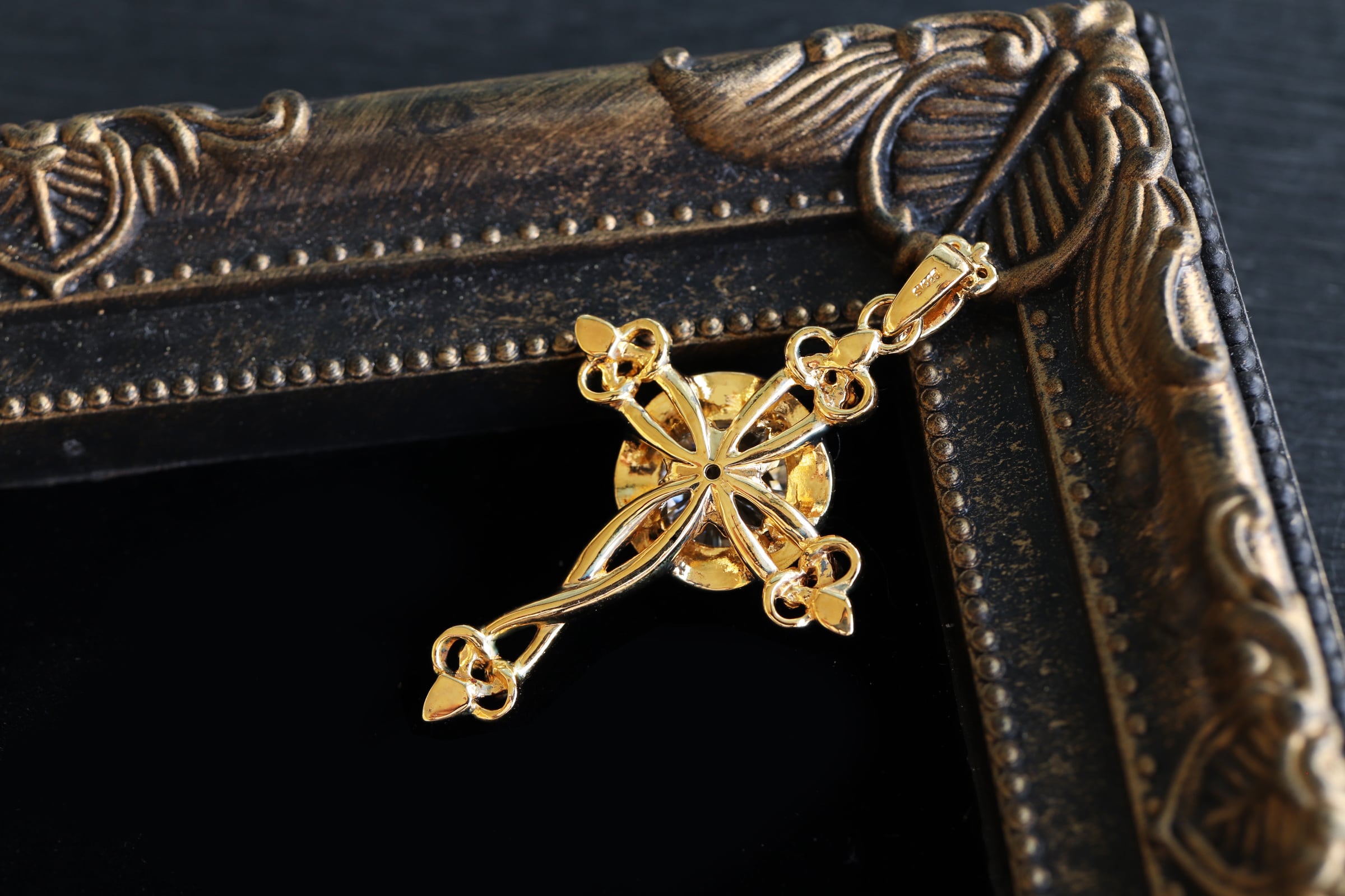 華やかで曲線的な装飾があしらわれた十字架モチーフペンダント。
