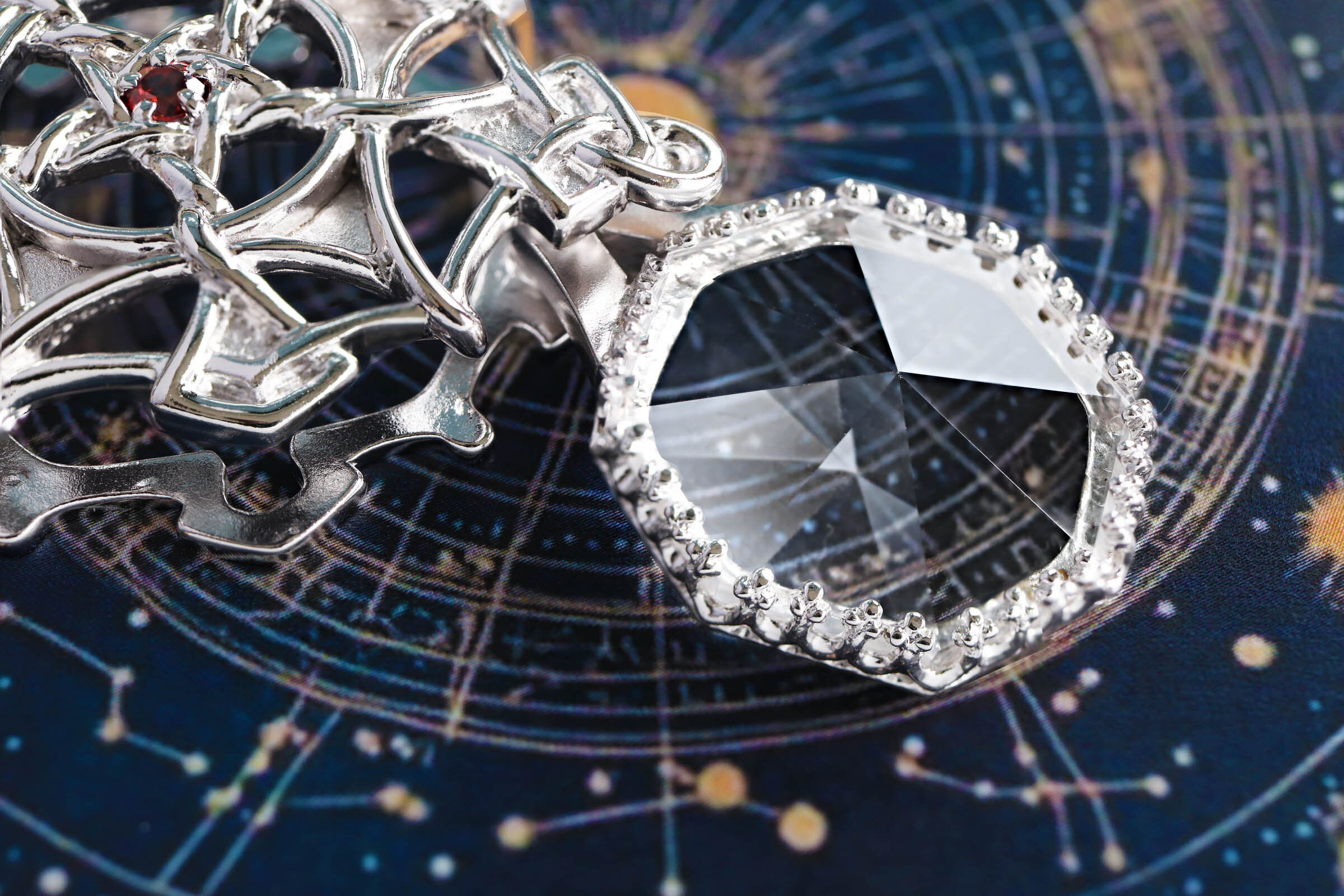 ペンダントには八角錐の水晶スコープが収納されていて、くるっと回して引き出す仕組みになっています。目の前の景色を華やかに変えるさまは、まるで宇宙の神秘を映し出す万華鏡のよう。