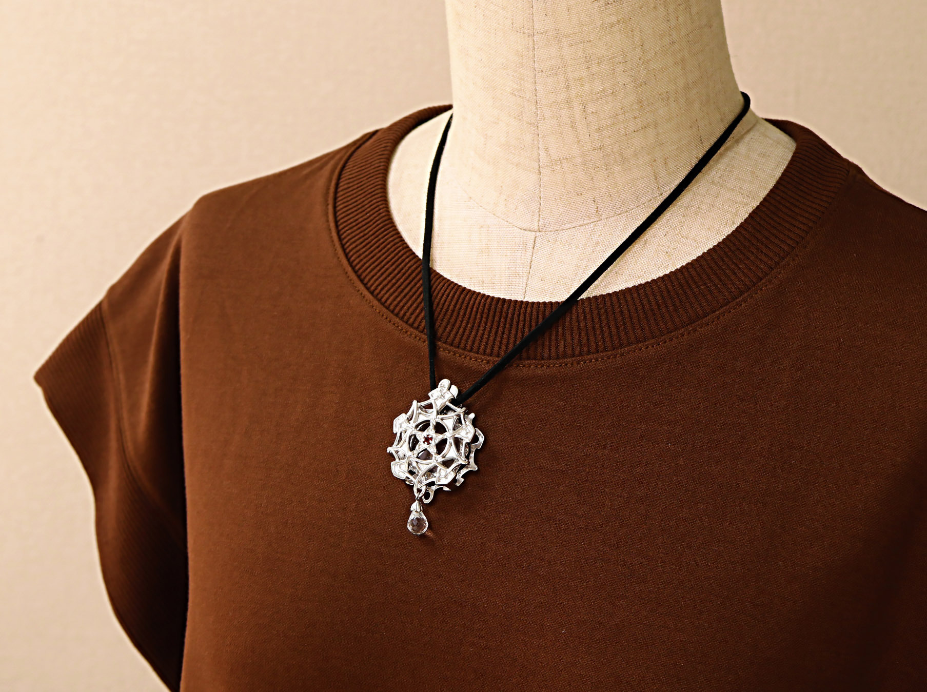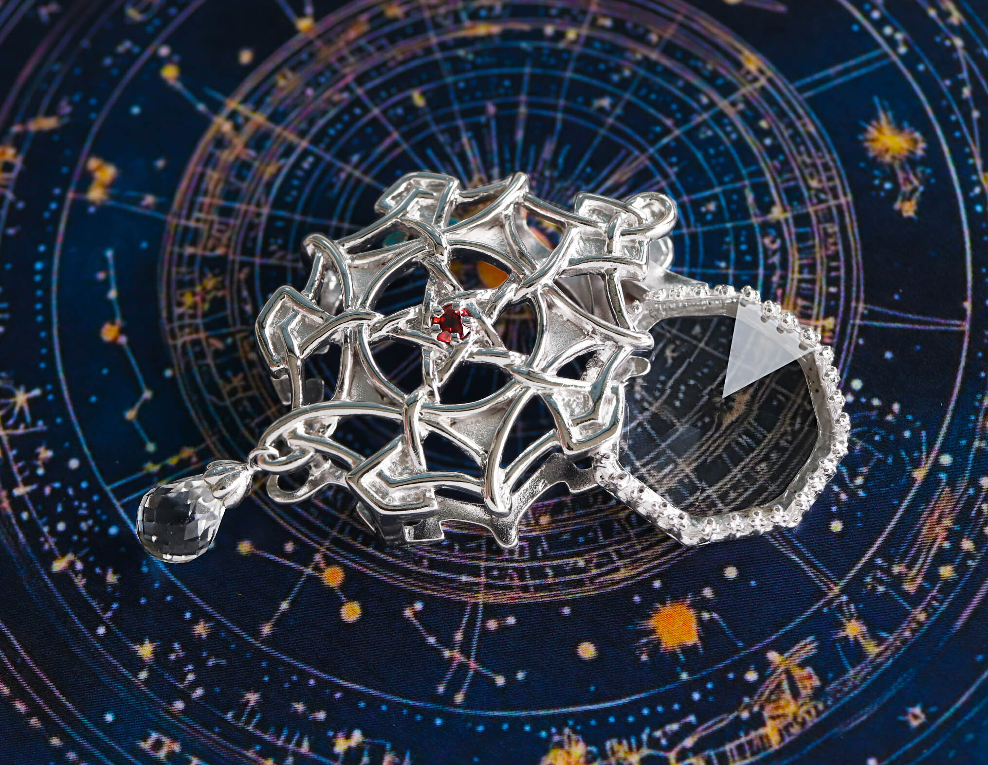 星の中央にガーネットが留められ、先端にブリオレットカットの水晶が光のしずくのように輝きます。